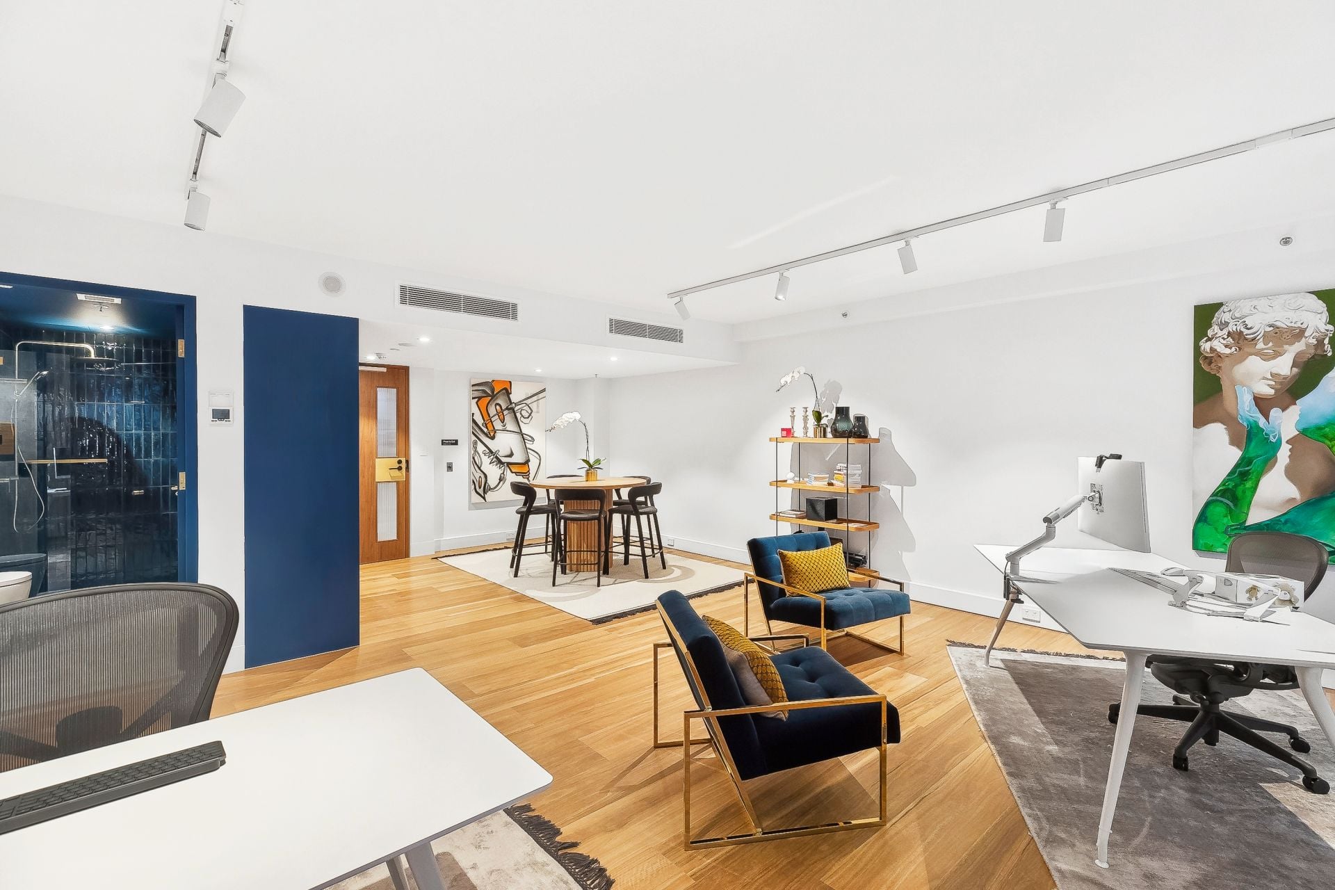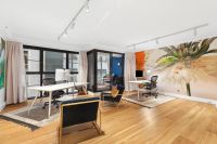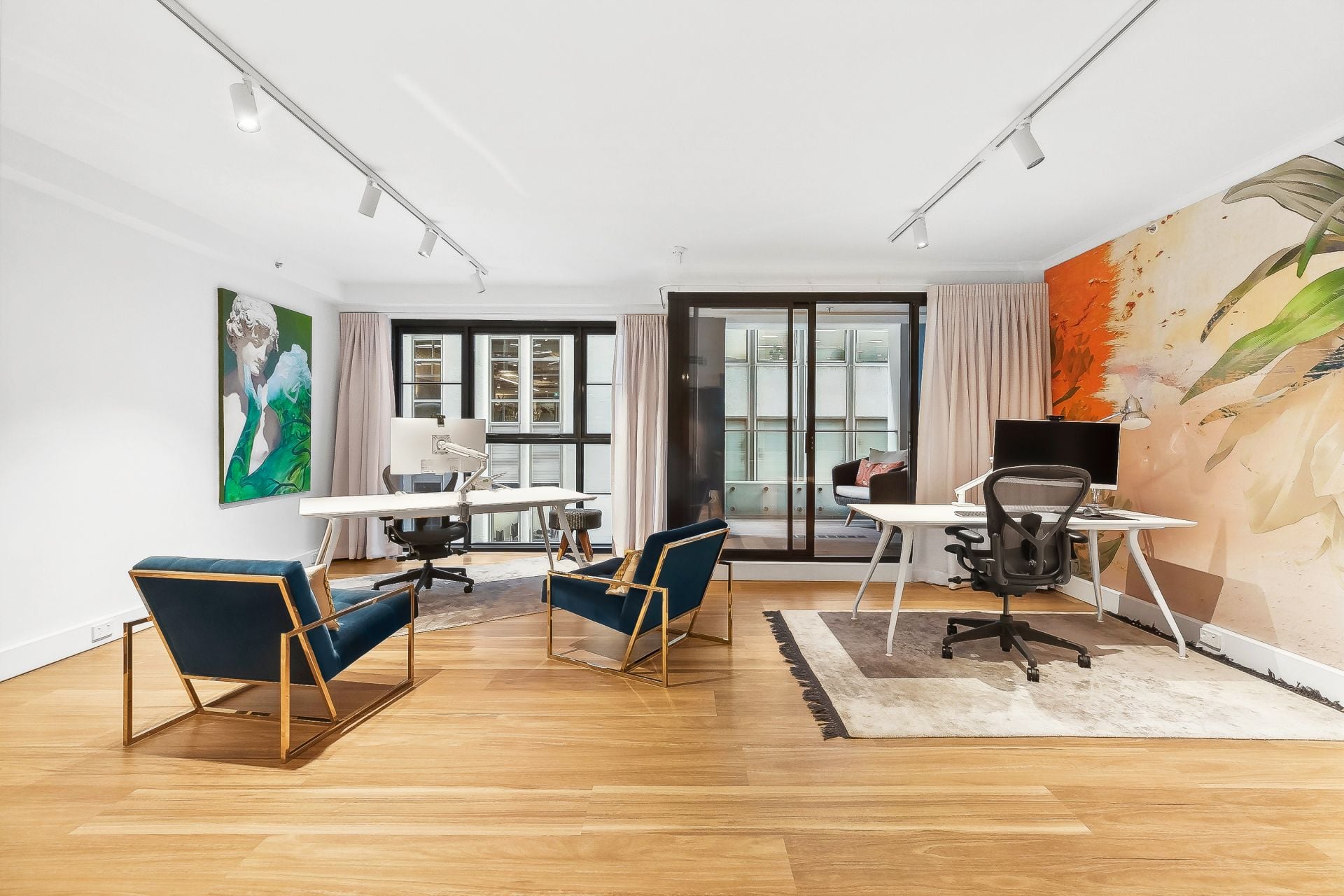 Internally the property has been stylishly designed with contemporary artworks and wall features to create an inspired workspace. The bespoke furniture package includes two executive desks, chairs, meeting table and two outdoor balcony sofas.